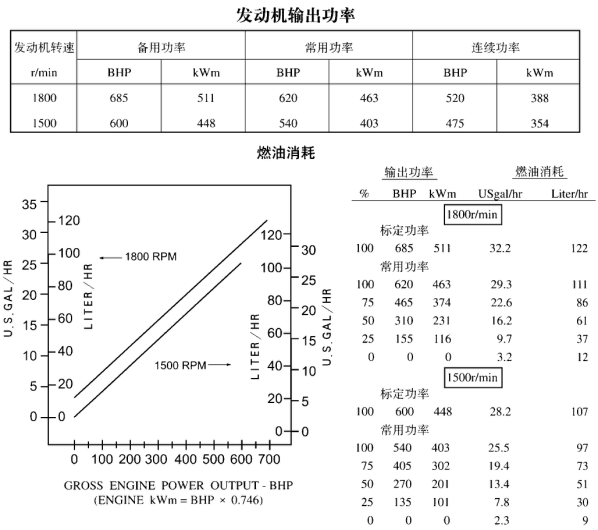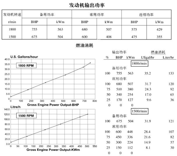性能數(shù)據(jù) 備用功率標定 常用功率標定 kW(BHP)@1800r/min(60Hz) 511(685) 463(620) 燃油消耗 L/h(U.S.gal./h) 122(32.2) 111(29.3) 空燃比 27.5 29.4 排氣流量 L/h(CFM) 1713(3630) 1579(3345) 排氣溫度°C(°F) 491(915) 471(880) 排放數(shù)據(jù) 單位:均為g/BHP.hr 成分 備用功率標定 常用功率標定 HC 0.20 0.17 NOX 9.46 8.86 CO 1.02 0.86 PM 0.15 0.14 SO2 0.59 0.59 CO2 490 490 N2 3100 3200 O2 420 470 H2O 180 180 試驗條件 試驗過程中,將發(fā)動機穩(wěn)定控制在標定轉速(±25r/min),標定功率(±2%)范圍內,使得壓力、溫度和排放數(shù)據(jù)穩(wěn)定。 燃油規(guī)范:硫(重量) 含量0.2%、十六烷值為42 —50的ASTM D975 No.2 柴油 燃油溫度:37℃(99°F) ±5℃(9°F) [燃油泵進口] 進氣溫度:25℃(77°F) ±5℃(9°F) 大氣壓力:100kPa (29.53inHg) ±3.4kPa (1inHg) 濕 度:NOX測量值按75喱H2O/lb.干空氣進行修正 | |