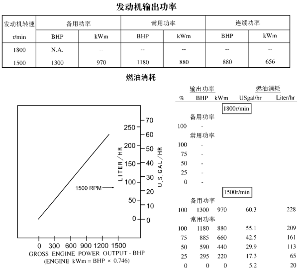 所有的數(shù)據(jù)均是基于發(fā)動(dòng)機(jī)帶燃油泵、水泵、機(jī)油泵、空濾器和消聲器運(yùn)轉(zhuǎn)時(shí)獲得的,但不帶有充電機(jī)、空壓機(jī)、風(fēng)扇、選用設(shè)備和驅(qū)動(dòng)件。所有的數(shù)據(jù)都是基于ISO 3046標(biāo)準(zhǔn)參考的條件—海拔110m(361ft),大氣壓力100kPa(29.53inHg),進(jìn)氣溫度25℃ (77°F),相對濕度30%,使用標(biāo)準(zhǔn)No.2號柴油或符合ASTM D975的柴油。