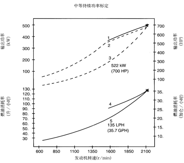 標(biāo)定條件:功率標(biāo)定是基于ISO8665標(biāo)準(zhǔn)規(guī)定的條件:大氣壓力為100kPa (29.612英寸汞柱),環(huán)境溫度為25℃(77°F),相對(duì)濕度為30%。螺旋槳軸功率為按97%扣除齒輪箱損失后的凈功率。燃油消耗是基于使用比重為838.9g/l(7.001磅/加侖),LHV為42780kJ/kW(18390Btu/lb)的35°API燃油。 1. 制動(dòng)功率 kW(HP) 4. 軸功率對(duì)應(yīng)的燃油消耗 2. 扣除齒輪箱損失后的軸功率 kW(HP) 5. 螺旋槳推進(jìn)曲線對(duì)應(yīng)的燃油消耗 3. 螺旋槳推進(jìn)曲線 持續(xù)功率:這種功率標(biāo)定的發(fā)動(dòng)機(jī)允許在全負(fù)荷工況下連續(xù)不斷地使用。這種功率為ISO3046標(biāo)準(zhǔn)功率 * 對(duì)非LTA發(fā)動(dòng)機(jī),其燃油耗高1-3%。 | ||||||