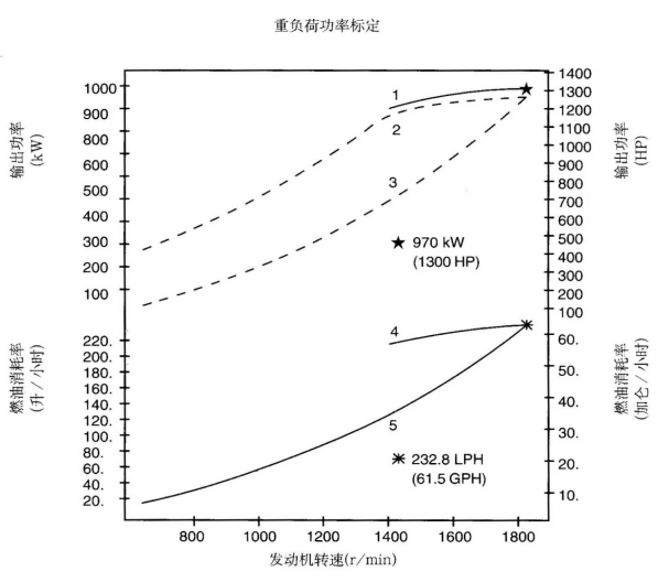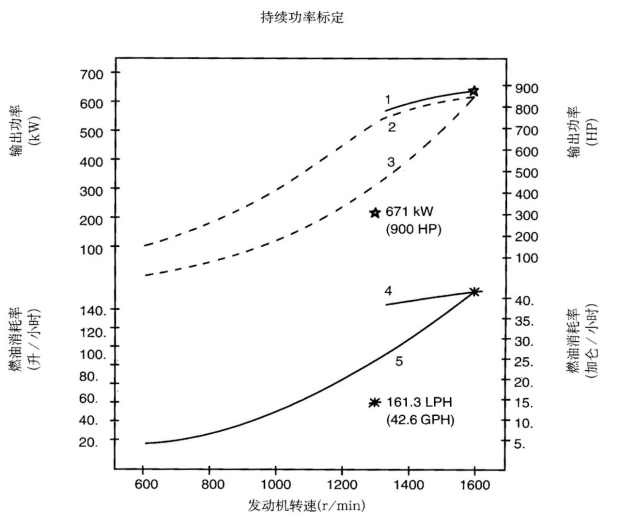 標(biāo)定條件:功率標(biāo)定是基于ISO8665標(biāo)準(zhǔn)規(guī)定的條件:大氣壓力為100kPa (29.612英寸汞柱),環(huán)境溫度為25℃(77°F),相對濕度為30%。螺旋槳軸功率為按97%扣除齒輪箱損失后的凈功率。燃油消耗是基于使用比重為838.9g/l(7.001磅/加侖),LHV為42780kJ/kW(18390Btu/lb)的35°API燃油。 4. 制動功率 kW(HP) 4. 軸功率對應(yīng)的燃油消耗 5. 扣除齒輪箱損失后的軸功率 kW(HP) 5. 螺旋槳推進曲線對應(yīng)的燃油消耗 6. 螺旋槳推進曲線 持續(xù)功率:這種功率標(biāo)定的發(fā)動機允許在全負(fù)荷工況下連續(xù)不斷地使用。這種功率為ISO3046標(biāo)準(zhǔn)功率 * 對非LTA發(fā)動機,其燃油耗高1-3%。 | |||||||