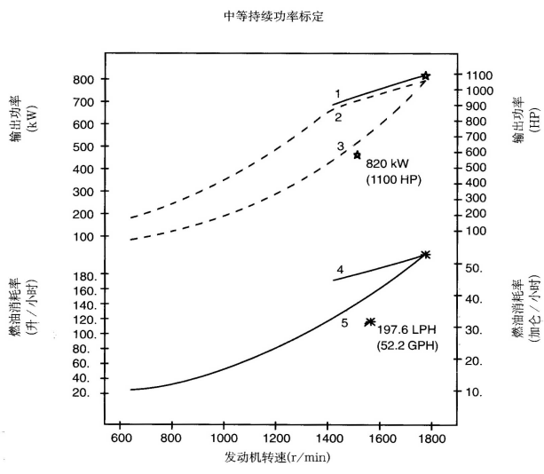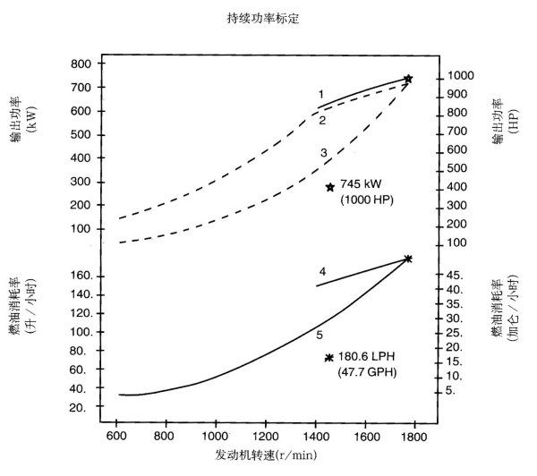標(biāo)定條件:功率標(biāo)定是基于ISO8665標(biāo)準(zhǔn)規(guī)定的條件:大氣壓力為100kPa (29.612英寸汞柱),環(huán)境溫度為25℃(77°F),相對濕度為30%。螺旋槳軸功率為按97%扣除齒輪箱損失后的凈功率。燃油消耗是基于使用比重為838.9g/l(7.001磅/加侖),LHV為42780kJ/kW(18390Btu/lb)的35°API燃油。 1. 制動功率 kW(HP) 4. 軸功率對應(yīng)的燃油消耗 2. 扣除齒輪箱損失后的軸功率 kW(HP) 5. 螺旋槳推進曲線對應(yīng)的燃油消耗 3. 螺旋槳推進曲線 持續(xù)功率:這種功率標(biāo)定的發(fā)動機允許在全負(fù)荷工況下連續(xù)不斷地使用。這種功率為ISO3046標(biāo)準(zhǔn)功率 * 對非LTA發(fā)動機,其燃油耗高1-3%。 | |||||||
