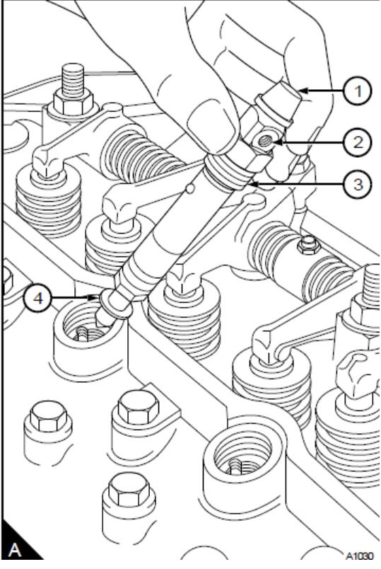 注意:拆下和廢棄座圈(A4)。如果噴油器凹處仍留有原來的座圈,當(dāng)增加新座圈時(shí),將會(huì)導(dǎo)致噴嘴凸起不正確。