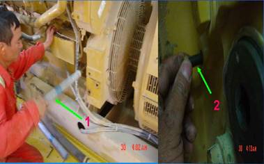 并按柴油機(jī)正常轉(zhuǎn)向?qū)w輪1轉(zhuǎn)動360°將定正時螺栓2擰入氣輪時,確定1號活塞位于是否壓縮沖程,還是排氣沖程式上死點。