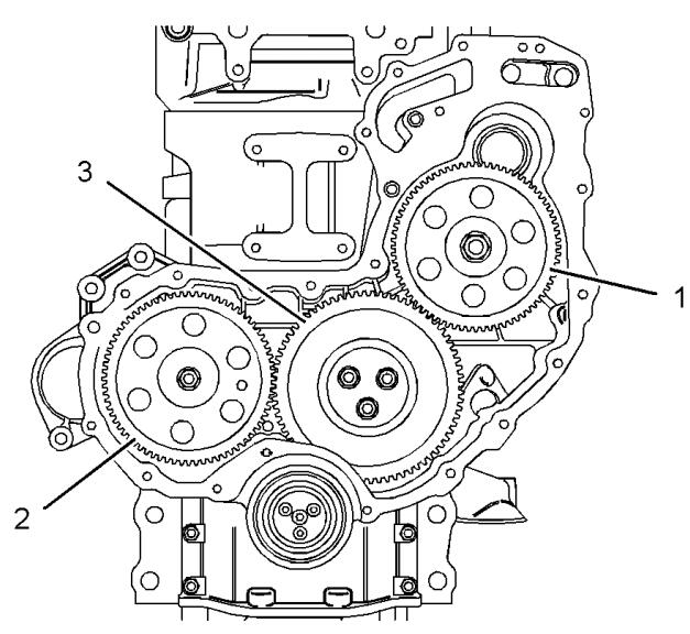 凸輪軸齒輪 (2) 與惰輪 (3) 之間的齒隙 ......... 0.05 至 0.15 mm (0.0020 至 0.0059 in)