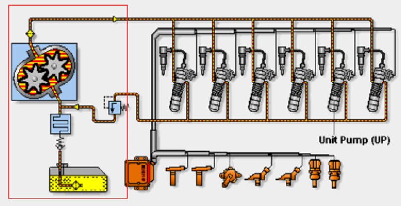 低壓油路組成:油箱、低壓輸油泵、燃油濾清器(粗濾器、細濾器)、相應(yīng)的油管。