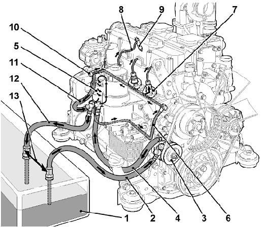 1 - 柴油箱 2 - 燃油進油管 3 – 燃油輸油泵 4 – 濾清器前燃油管 5 – 燃油濾清器 6 –濾清器后燃油管 7 – 單體泵 8 – 高壓油管 9 – 噴油器 10 – 限壓閥 11 – 回油管 12 – 回油管 13 – 燃油箱內(nèi)進回油管距離規(guī)定