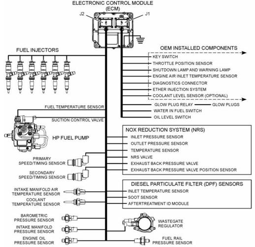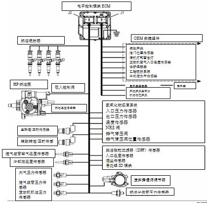 發(fā)動機有一個電子控制系統。這個系統也監(jiān)視著柴油微粒過濾器(DPF) 和氮氧化物還原系統(NRS)。
