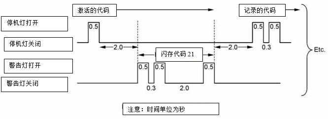 例如,“警告”燈亮起500毫秒,然后熄滅300毫秒,然后亮起500毫秒,然后熄滅2000毫秒,然后亮起500毫秒,然后熄滅,指示激活的診斷代碼“21”。