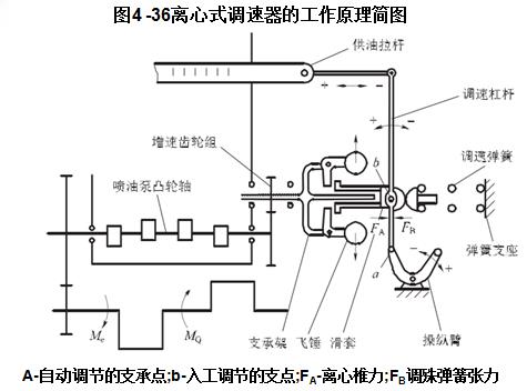 柴油機(jī)在工作時(shí),通過(guò)曲軸驅(qū)動(dòng)裝在噴油泵凸輪軸后端上的飛錘旋轉(zhuǎn),飛錘受離心力的作用而向外飛開(kāi)。此離心力產(chǎn)生的推力FA和調(diào)速?gòu)椈傻膹埩B。在某一轉(zhuǎn)速下相平衡,而使調(diào)速器和噴油泵保持在一定的位置下工作。