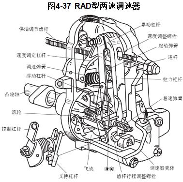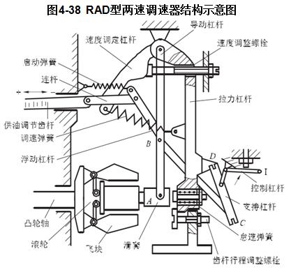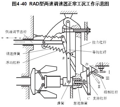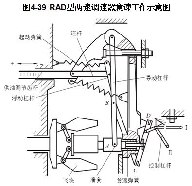 圖4 - 37所示為CA1091 K3型載貨汽車(chē)柴油機(jī)所用的RAD型兩速調(diào)速器,其調(diào)速原理結(jié)構(gòu)示意圖如圖4-38所示。
