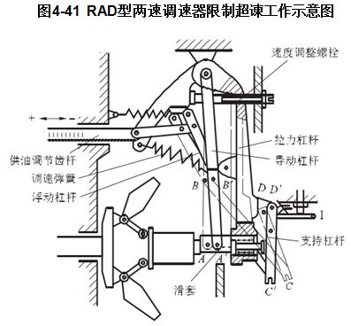 ④限制超速。如圖4 -41所示,柴油機(jī)轉(zhuǎn)速超過(guò)額定轉(zhuǎn)速時(shí),飛塊離心力就能克服調(diào)速?gòu)椈傻睦?,滑套推?dòng)拉力杠桿并帶動(dòng)導(dǎo)動(dòng)杠桿繞其上支點(diǎn)向右偏轉(zhuǎn),使B點(diǎn)移動(dòng)到B’點(diǎn),D點(diǎn)移動(dòng)到D’點(diǎn),在拉力杠桿的帶動(dòng)下,支持杠桿繞其中間支點(diǎn)順時(shí)針?lè)较蚱D(zhuǎn),使C點(diǎn)移動(dòng)到C’點(diǎn);而由B’和C’點(diǎn)決定廠浮動(dòng)杠桿也發(fā)生了順時(shí)針?lè)较虻钠D(zhuǎn),帶動(dòng)供油調(diào)節(jié)齒桿向供油減少的方向移動(dòng),從而限制柴油機(jī)轉(zhuǎn)速不超過(guò)額定的工作轉(zhuǎn)速。利用速度調(diào)整螺栓改變調(diào)速?gòu)椈傻念A(yù)緊力,就可以調(diào)節(jié)調(diào)速器所能限定的柴油機(jī)最高轉(zhuǎn)速。