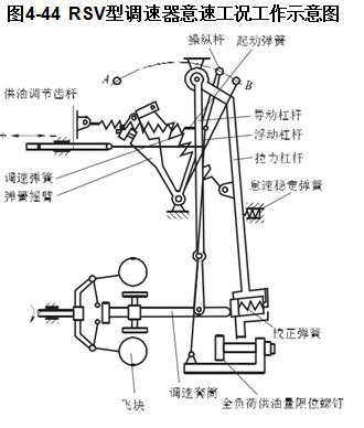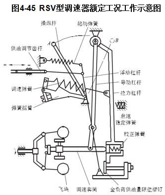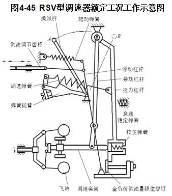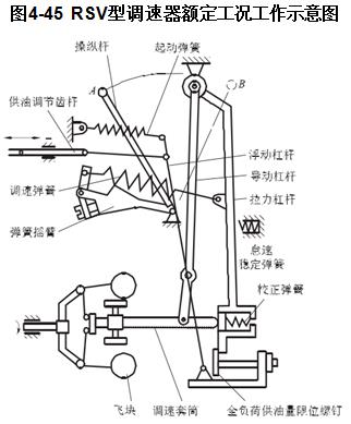 ③額定工況。如圖4-45所示,當(dāng)駕駛員將加速踏板踩到底,使操縱處于極限位置A時(shí),調(diào)速?gòu)椈蛇_(dá)到最大拉伸狀態(tài),此時(shí)拉力最大。張緊的調(diào)速?gòu)椈蓪⒗Ω軛U拉靠在全負(fù)荷供油量限位螺釘上,并通過(guò)調(diào)速套筒、導(dǎo)動(dòng)杠桿和浮動(dòng)杠桿將供油調(diào)節(jié)齒桿推至全負(fù)荷供油位置,亦即柴油機(jī)在額定工況下工作。此時(shí),飛塊的離心力與調(diào)速?gòu)椈傻淖饔昧ζ胶狻?br />