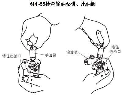 ①檢查進(jìn)、出油閥密封性。如圖4 - 55所示,用左手指按住出油口,用右手上下拉動手柄,手指能感覺到脈動壓迫感,當(dāng)放松手柄時,手柄能自動彈起,說明進(jìn)油閥密封良好;擰下進(jìn)油管接頭,用手指按住進(jìn)油口,上下拉動輸油泵手柄,手指能感覺到脈動的吸力,當(dāng)放松手柄時,手柄能自動吸回去,說明出油閥密封性良好。