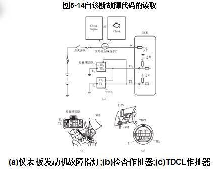 如圖5-14 (a)所示;電控單元檢測插座一般位于發(fā)動機艙內。當將檢測插座與檢測端子TE對地短接后(如圖5-14 ( b)所示),發(fā)動機警告燈會閃爍,閃爍次數(shù)即故障代碼;故障診斷插座通常位于儀表板下方,它是電控系統(tǒng)診斷信號的專用連接器,主要用于與專用車外故障診斷儀(也稱電腦解碼器)相連接,進行車外診斷,以擴充隨車診斷系統(tǒng)的診斷信息和診斷功能。