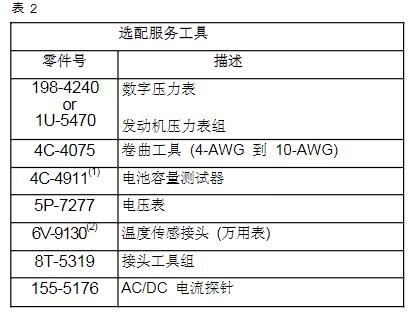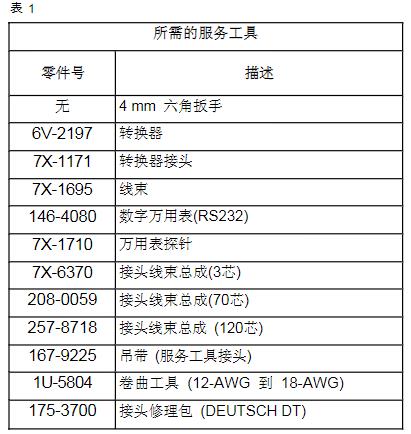 卡特電氣服務工具被設計用來幫助服務工程師完成以下任務:• 獲得信息• 分析系統(tǒng)• 系統(tǒng)校準• 系統(tǒng)設置• 數據鏈路通訊所需的服務工具表1列出的工具是服務工程師完成本手冊上的測試程序所需要的。