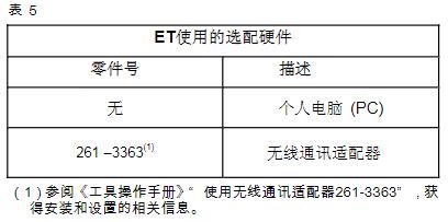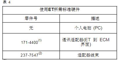 注意:更多卡特ET的使用信息和對應計算機配置需求,請參閱卡特ET軟件的相關文檔。連接ET用通訊適配器II連接表4列出連接卡特ET所需要的標準硬件。