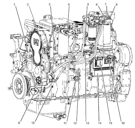 圖4發(fā)動機左側(cè)視圖(范例)(1) 發(fā)動機冷卻溫度傳感器(2) 次速度/時間感應(yīng)塞(3) 進氣歧管壓力傳感器(4) 噴油器閥蓋進口接頭(5) 進氣歧管空氣溫度傳感器(6) 壓差開關(guān)(燃油)(7) 燃油壓力感應(yīng)塞(8) 燃油溫度傳感器(9)主速度/時間感應(yīng)塞(10) 正時校準(zhǔn)口(11) 大氣壓力感應(yīng)塞(12) 機油壓力感應(yīng)塞(13) 正時校準(zhǔn)探針接口(14) 發(fā)動機控制模塊(ECM)(15) J2/P2 ECM 接頭 (16) J1 ECM 接頭
