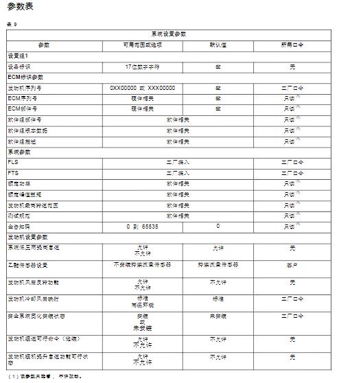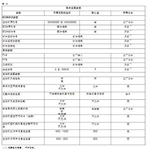 系統(tǒng)設(shè)置參數(shù)i02491439系統(tǒng)設(shè)置參數(shù)SMCS代碼:1901S/N:ZXT1-Up;LHX1-UpS/N:ASX1-Up;LHX1-UpS/N:ZBD1-Up;LHX1-UpS/N:AZW1-Up;LHX1-UpS/N:ZHC1-Up;LHX1-UpS/N:AWF1-Up;LHX1-UpS/N:XTR1-Up;RHX1-UpS/N:BXD1-Up;RHX1-UpS/N:XDC1-Up;RHX1-UpS/N:BXY1-Up;RHX1-UpS/N:BTX1-Up;RHX1-UpS/N:4091-Up;RHX1-Up系統(tǒng)設(shè)置參數(shù)是特別設(shè)定的發(fā)動機排放水平、功率范圍和特別應(yīng)用的參數(shù)。參數(shù)的默認值由工廠編程設(shè)定。一些參數(shù)可以改變以適合發(fā)動機的特殊應(yīng)用。如果電子控制模塊(ECM)更換,必須重新載入系統(tǒng)設(shè)置參數(shù)。如果你更新ECM快存文檔,則不必重新載入系統(tǒng)設(shè)置參數(shù)。某些設(shè)置參數(shù)被標記在發(fā)動機信息銘牌上。注意:如果受工廠密碼保護的參數(shù)被改變,卡特免除擔保責任。參數(shù)描述設(shè)備標識“設(shè)備標識”參數(shù)允許客戶向ECM輸入一些描述以明確發(fā)動機的應(yīng)用。字段中最多能填入17個字符。