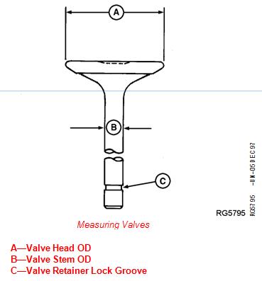 3.測量約翰迪爾強(qiáng)鹿柴油機(jī)閥頭外徑(A)。比較閥桿O、 D.(B)用導(dǎo)向器內(nèi)徑確定間隙,如本組下文所述。