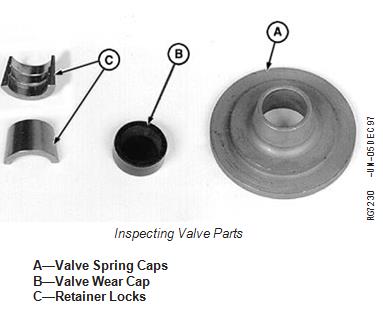 2.檢查約翰迪爾強(qiáng)鹿柴油機(jī)閥桿上的閥護(hù)圈鎖槽(C)是否損壞。同時檢查閥桿是否有擦傷跡象,這可能表明氣門導(dǎo)管與閥桿之間的間隙不足。如果缺陷明顯,則更換。