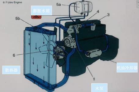 • 工程機(jī)械發(fā)動(dòng)機(jī)上應(yīng)用最普遍的是強(qiáng)制循環(huán)式水冷卻系,它由水泵潤(rùn)滑油冷卻器、變速箱冷卻器、節(jié)溫器、缸蓋、缸體、散熱器進(jìn)水管、水泵進(jìn)水口、散熱器、補(bǔ)液箱、風(fēng)扇等構(gòu)成。水泵通過水管從散熱器內(nèi)吸入低溫水,使冷卻水在發(fā)動(dòng)機(jī)缸體和缸蓋的水道中不停地循環(huán)流動(dòng),冷卻水吸收熱量后又流回散熱器。風(fēng)扇使空氣高速流過散熱器,將散熱器中水地?zé)崃可l(fā)到空氣中去。