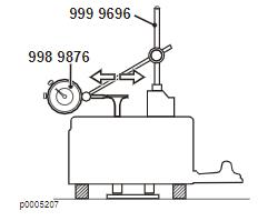 4 放上9989876 千分表和 9999696 磁力架,使千分表尖端與閥盤邊緣接觸。將閥移到旁邊,朝向排氣導(dǎo)管或進(jìn)氣導(dǎo)管。讀取千分表上的值。