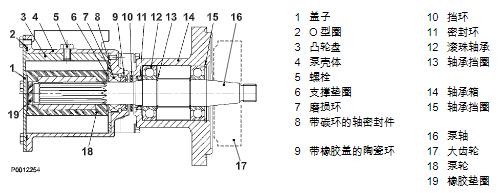 2 將沃爾沃volvo海水泵蓋連同 O 型圈一起拆下。將橡膠墊圈從葉輪上(19)拆下。用葉輪拔具拉出葉輪。