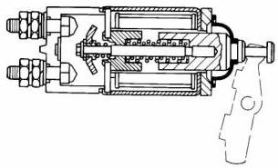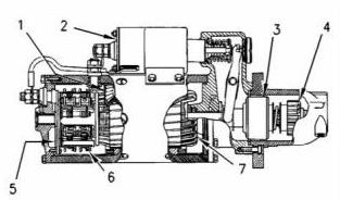 電磁閥(2)在空心氣缸周圍有繞組(一組或兩組)。彈簧加載的柱塞位于氣缸內(nèi)。柱塞可以前后移動(dòng)。當(dāng)啟動(dòng)開(kāi)關(guān)閉合,電流通過(guò)繞組輸送時(shí),產(chǎn)生磁場(chǎng)(1)。磁場(chǎng)(1)將柱塞在氣缸中向前拉。這會(huì)移動(dòng)換檔桿,使小齒輪驅(qū)動(dòng)齒輪與齒圈接合。然后,柱塞前端通過(guò)電磁閥(2)的蓄電池和馬達(dá)端子進(jìn)行接觸。接下來(lái),起動(dòng)馬達(dá)開(kāi)始轉(zhuǎn)動(dòng)發(fā)動(dòng)機(jī)的飛輪。當(dāng)起動(dòng)開(kāi)關(guān)打開(kāi)時(shí),電流不再流過(guò)繞組。彈簧現(xiàn)在將柱塞推回到原始位置。同時(shí),彈簧使小齒輪遠(yuǎn)離飛輪。