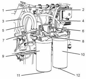 6. 拆下燃油濾清器(9)和(10)。從燃油濾清器上拆下O形密封圈和燃油濾清器濾芯。有關(guān)更多信息,請參閱操作和保養(yǎng)手冊,“燃油系統(tǒng)粗濾器-更換”和操作和保養(yǎng)手冊,“燃油系統(tǒng)細濾器-更換”。