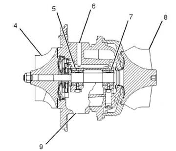 (4)壓縮機(jī)葉輪 (5)軸承 (6)機(jī)油進(jìn)口 (7)軸承 (8)渦輪機(jī)葉輪 (9)出油口