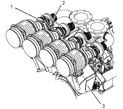 Perkins4016柴油發(fā)動(dòng)機(jī)在發(fā)動(dòng)機(jī)后端安裝了四個(gè)渦輪增壓器(1)。每個(gè)渦輪增壓囂的渦輪機(jī)側(cè)都連接至該渦輪增壓器的排氣歧管。每個(gè)渦輪增壓器的壓縮機(jī)側(cè)都通過(guò)管道與后冷器殼體相連。
