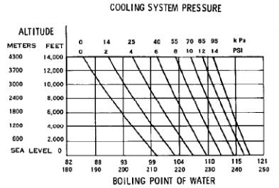 沸點(diǎn)受三種因素影響:壓力,海拔和冷卻液中的乙二醇濃度。液體沸點(diǎn)隨著壓力增加而增加。液體沸點(diǎn)隨著海拔高度增加而降低。圖39顯示壓力和海拔對水的沸點(diǎn)的影響。