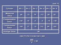 康明斯Cummins QSK23發(fā)動(dòng)機(jī)把每個(gè)排氣出口補(bǔ)償后的溫度值加起來(lái)并計(jì)算平均溫度值。任何補(bǔ)償后的溫度值低于平均值超過(guò)20℃的氣缸被認(rèn)為是不正常的。在此案中所有氣缸都正常。