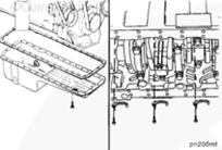 拆下油底殼。參考步驟 007-025。拆下活塞冷卻噴嘴。參考步驟 001-046。