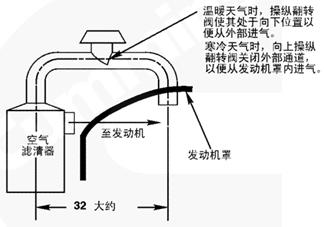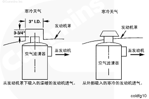 C [10°F] 時,按照圖 9 或 10 的進氣設(shè)計,從發(fā)動機罩下吸進空氣,以防止空氣濾清器堵塞。