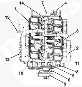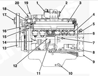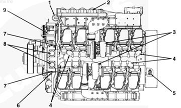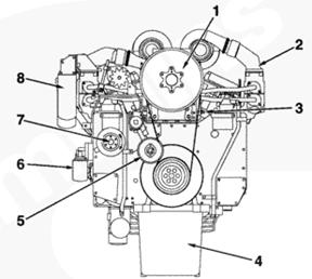 1渦輪增壓器進口接頭,2 ATA 跨接接頭,3排氣口接頭,4發(fā)動機轉速傳感器,5冷卻液出口接頭,6前吊耳,7飛輪殼,8曲軸箱通風裝置,9風扇輪轂,10充電機,11冷卻液液位開關接頭,12組合式機油濾清器,13燃油進口管接頭,14后吊耳。