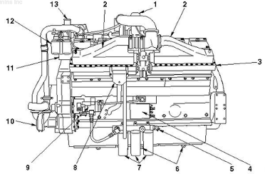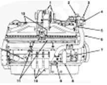 1渦輪增壓器,2 LTA出水管接頭,3發(fā)動機出水管接頭,4節(jié)溫器殼體,5中冷器排氣管,6旁通水管,7水泵,8水泵排放,9冷卻液進口接頭,10機油濾清器,11中冷器總成,12機油加注口和機油標尺管(位置可能會變化),13進氣歧管蓋。