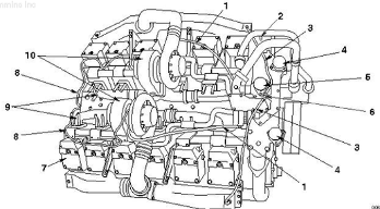 1渦輪增壓器冷卻液供應管,2中冷器進水口溫度傳感器,3冷卻液排氣管連接式中冷器,4發(fā)動機出水管接頭,5 LTA出水管接頭,6中冷器排氣管連接式發(fā)動機,7搖臂室蓋,8渦輪增壓器機油供油管,9排氣歧管,10渦輪增壓器。