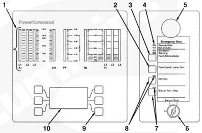 1數字 VAC 儀表板,2面板指示燈/指示燈測試按鈕,3故障確認按鈕,4遠程起動、非自動、停機、警告狀態(tài),5緊急停機按鈕,6 0/手動/自動開關,7手動運行/停機按鈕指示燈,8運行按鈕指示燈,9顯示菜單選擇按鈕(6 個之中的 1 個),10圖形顯示器。