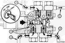 當(dāng)鑰匙開關(guān)接通時,Bosch® EHAB 裝置通電并且滑閥移動,使燃油從油箱流到燃油輸油泵或從濾清器流入噴油泵油道。自油箱流入的燃油,自噴油泵油道的燃油溢流,流至輸油泵的燃油,已過濾燃油流入,噴油泵進(jìn)口(已過濾燃油)