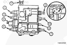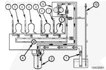 溢流閥 (8) 調(diào)節(jié)向噴油泵的供油壓力并將多余的燃油輸送回油箱 (1)。燃油從溢流閥(8)中流過,并流過一個 “T”,在這里與從噴油器(9)中未使用的燃油會合在一起。然后燃油將流過燃油連接塊 (3) 并流回到油箱 (1) 中。