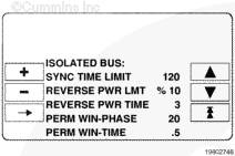 容許窗口時(shí)間 (PERM WIN-TIME):調(diào)整在 PowerCommand® 控制系統(tǒng)發(fā)出斷路器閉合信號(hào)前發(fā)電機(jī)組必須與系統(tǒng)母線保持同步的時(shí)間期限(單位:秒)??烧{(diào)整的范圍是 0.5 至 5 秒。對(duì)于隔離母線的建議值是 0.5 秒。(將控制系統(tǒng)調(diào)整為更小的同步檢查窗口或更長(zhǎng)的延時(shí)會(huì)造成同步時(shí)間延長(zhǎng)。)