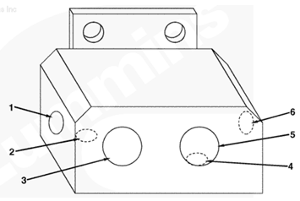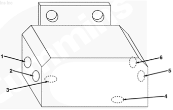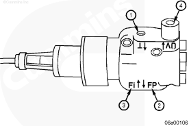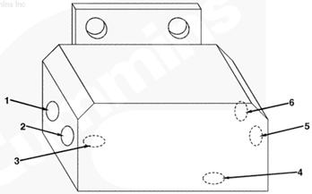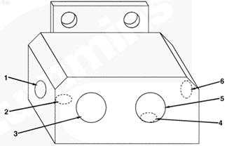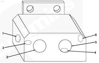 1左排燃油連接塊(零件號 3094175),2燃油噴油泵溢流閥的燃油(回油),3自左排噴油器回油管的燃油,4至左排燃油歧管的回油,5插入