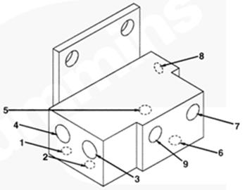 1右排歧管(零件號 3094906),2流至 EHAB 進口的燃油(抽吸未經(jīng)過濾的燃油),3自右排噴油器回油管和噴油泵溢流管/EHAB(兩條管路)的回油,4自左排燃油歧管(右排供油)的燃油(抽吸未經(jīng)過濾的燃油),5流至左排燃油歧管(自右排回油)的燃油,6自濾清器和左排燃油歧管的燃油(經(jīng)過濾的增壓燃油),7流至左排燃油歧管(未經(jīng)過濾的增壓燃油)和濾清器的燃油,8自輸油泵的燃油(未經(jīng)過濾的增壓燃油),9流至噴油泵進口/EHAB 的燃油(經(jīng)過濾的增壓燃油)。