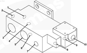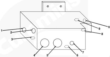 1右排燃油歧管(零件號 3094774),2自左排燃油連接塊流入的燃油(抽吸未經(jīng)過濾的燃油),3至左排燃油連接塊的回油,4自右排噴油器回油管和噴油泵溢流管/EHAB(兩條管路)的回油,5流至 EHAB 的燃油(抽吸未經(jīng)過濾的燃油),6自左排燃油歧管流入的燃油(經(jīng)過濾的增壓燃油),7流至左排燃油歧管的燃油(未經(jīng)過濾的增壓燃油),8自輸油泵流入的燃油(未經(jīng)過濾的增壓燃油),10流至 EHAB/噴油泵進口的燃油(經(jīng)過濾的增壓燃油),