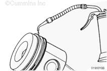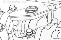 用發(fā)動機盤車工具(零件號 3824591)旋轉(zhuǎn)曲軸,直到活塞位積碳下方(可在活塞環(huán)行程區(qū)域的上方找到)。
