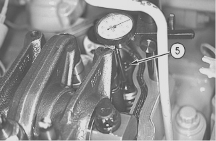 5. Apply a force of 5 N (1 lb) to 45 N (10 lb). Push down on the top contact surface of the valve bridge. Zero the indicator.稍微用力把氣門(mén)過(guò)橋( 4 )輕輕按下至到貼住氣門(mén)過(guò)橋的表面. 然后把千分表調(diào)至“0”位置.