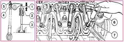 調(diào)整氣門間隙之前,停機(jī)30分鐘,油溫要低于80℃。用塞尺6檢查2、3之間的間隙1,塞尺塞入后要有輕度                                           磨擦,正確的氣門間隙;進(jìn)氣門:0.3mm,排氣門:0.5mm,(每次更換氣缸墊后,氣門間隙增加0.1mm,運(yùn)轉(zhuǎn)                                      50-150小時(shí)后重新調(diào)整)。按如下步驟調(diào)整氣門間隙: -松開鎖母4。用改錐7擰螺栓5,上緊鎖母4,得到正確的氣門間隙。                                       檢查、調(diào)查其他各缸的氣門間隙。裝好氣門室蓋(如需要,更換墊圈)。