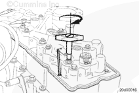 如果沒有正確規(guī)格的塞尺,以下方法可以用來代替塞尺方法。使用盤車工具(零件號 3824591)轉(zhuǎn)動曲軸,使燃油泵齒輪上的標(biāo)記與齒輪室蓋上的上止點(diǎn)標(biāo)記對齊。