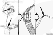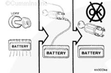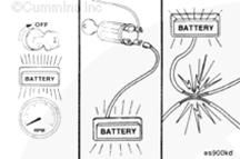 蓄電池可能會有易爆性氣體逸出。為了盡可能避免人身傷害,在維護(hù)蓄電池前,必須保持康明斯B3.3和QSB3.3發(fā)動機(jī)艙通風(fēng)良好。為避免產(chǎn)生電弧,應(yīng)首先拆下負(fù)極 (-) 蓄電池電纜,并最后連接負(fù)極 (-) 蓄電池電纜。
